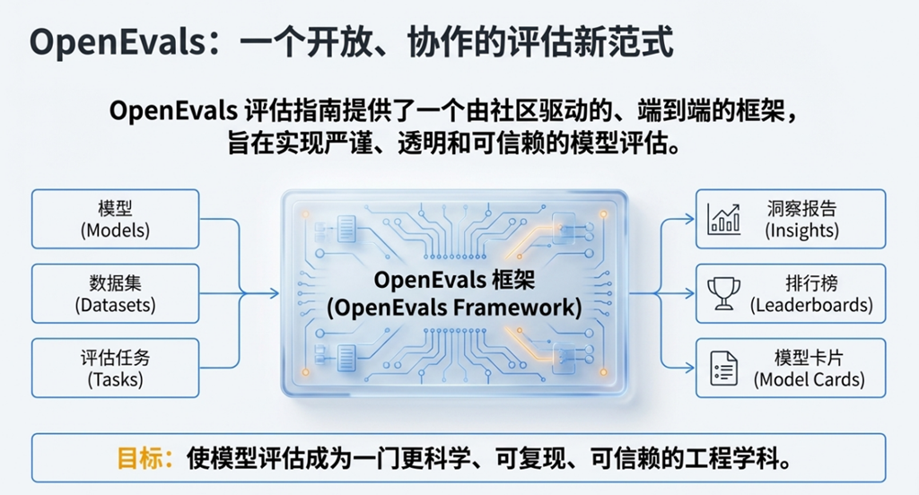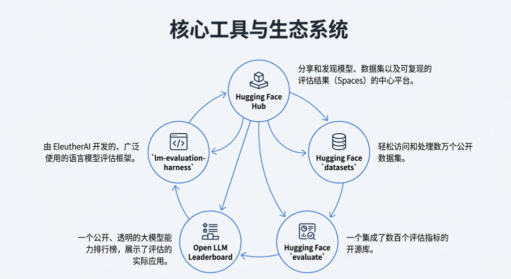 Hugging Face 的开放评估生态,正是对上一章节所述挑战的直接回应,其设计的核心理念在于通过开放性、协作性和透明度,从根本上改变 AI 模型的评估范式。它并非一个孤立的工具,而是一个由社区共同驱动、与 Hugging Face 生态系统深度集成的评估基础设施,旨在为 AI 开发的全生命周期提供可靠的度量衡。
