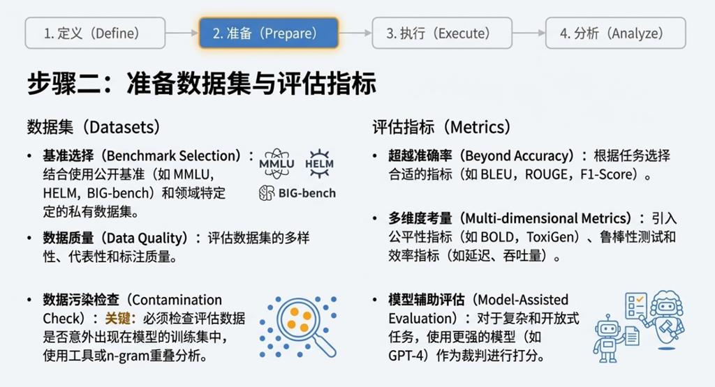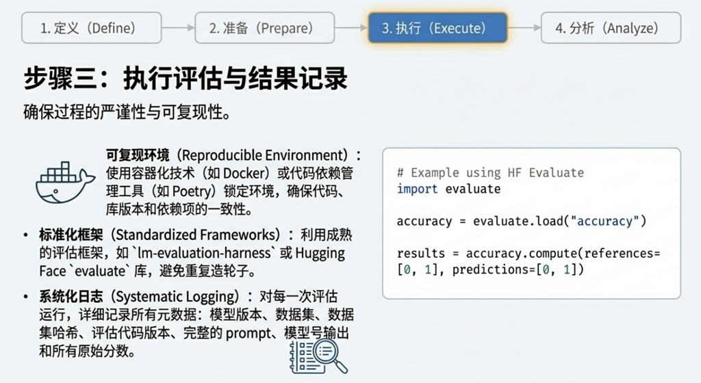 evaluate 评估库 | 一个标准化的开源 Python 库,提供了数十种常用评估指标(如 BLEU, ROUGE, F1)的简易实现。用户只需几行代码即可加载和计算指标,极大简化了评估流程。 | 降低评估门槛: 通过提供可靠、易用的标准指标实现,将开发者从重复的“造轮子”工作中解放出来,确保了评估方法的一致性。 |