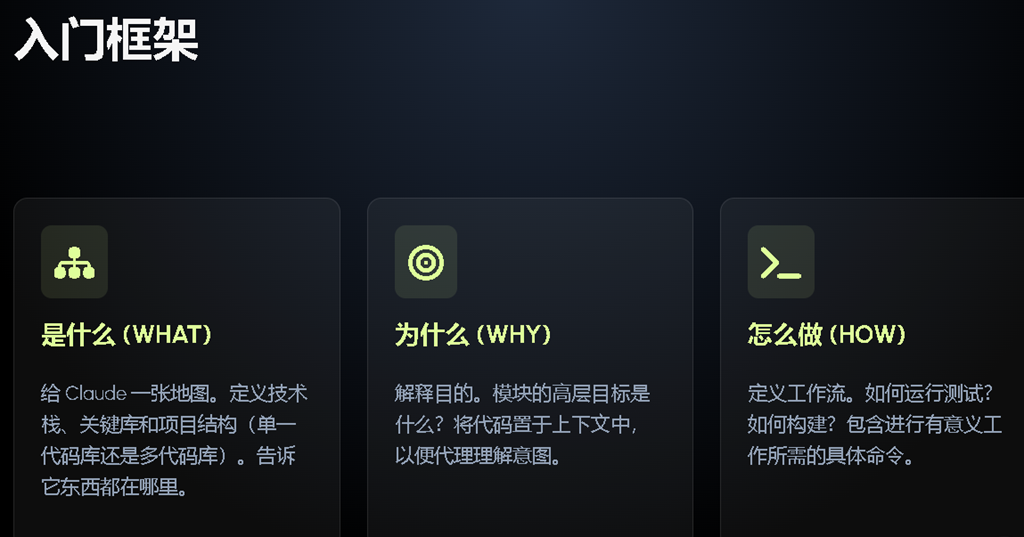 CLAUDE.md 用于帮助 Claude 入门你的代码库。它应该定义你项目的 WHY(为什么)、WHAT(是什么) 和 HOW(怎么做)。