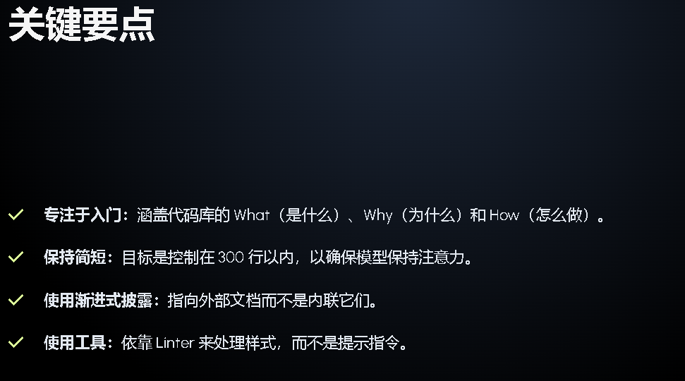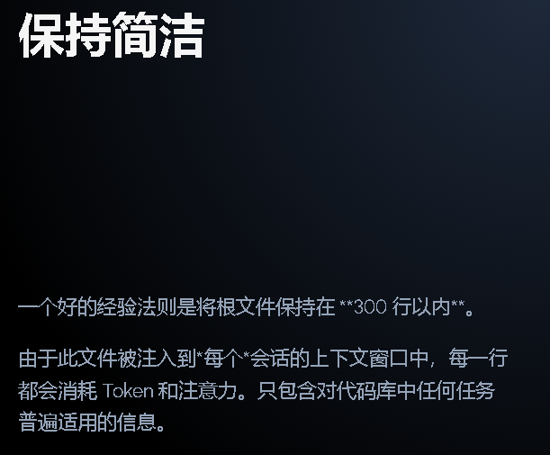 在长度方面,少即是多的原则同样适用。虽然 Anthropic 关于 CLAUDE.md 文件长度没有官方建议,但普遍共识是 < 300 行是最好的,越短越好。