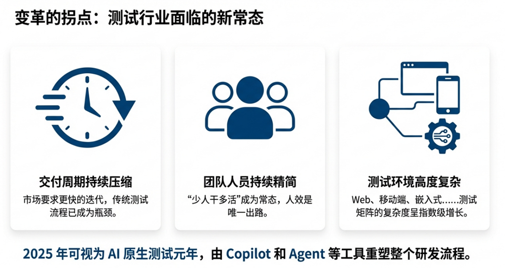 • 交付周期与团队规模的压力: 市场竞争日益激烈,软件产品的交付周期被持续压缩,同时企业普遍面临团队人员规模缩减的挑战。在“既要马儿跑得快,又要马儿少吃草”的严峻现实下,传统的测试方法已难以满足高速迭代的需求,寻找能够实现效能倍增的AI解决方案成为必然选择。