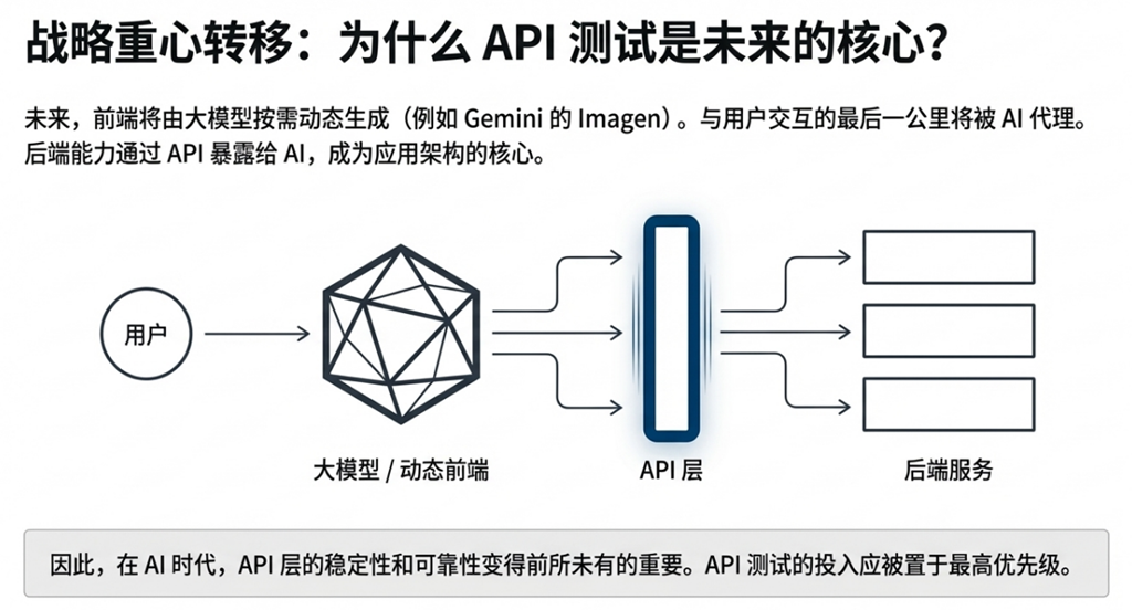 这一趋势将带来深刻的架构演进:应用的大部分后端能力,如数据查询、业务处理等,都将以API的形式暴露给大模型,由大模型调用这些API来满足最终用户的需求。这意味着,应用架构将逐渐转向于API为中心。这种架构演进使得传统的、基于UI的端到端测试变得脆弱且不可靠,从而迫使质量保障的战略重心,向更为稳定且基于契约定义的API层进行战略性转移。