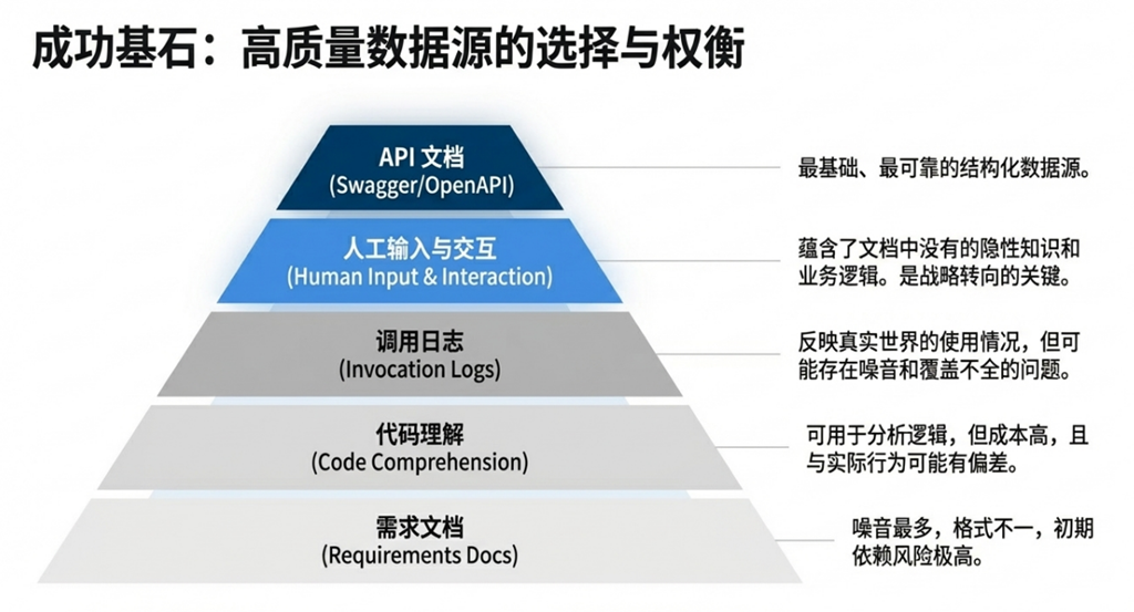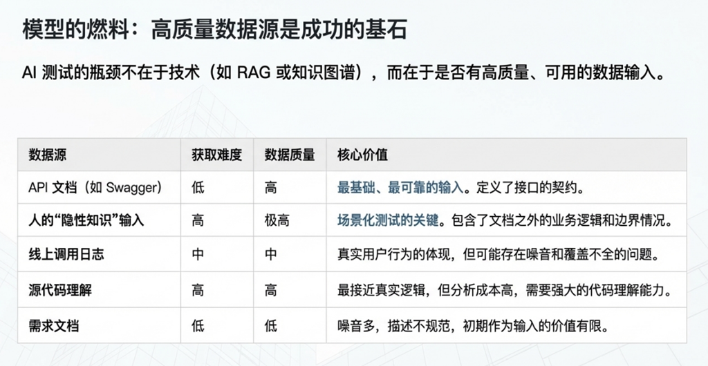 大模型能力的发挥,高度依赖于高质量的输入数据。这已成为一个超越具体技术的根本性“卡点”。在AI赋能API测试的场景中,拥有高质量、结构化的数据源是实现理想效果的根本前提。根据的实践分析,不同数据源的优先级和可用性存在明显差异: