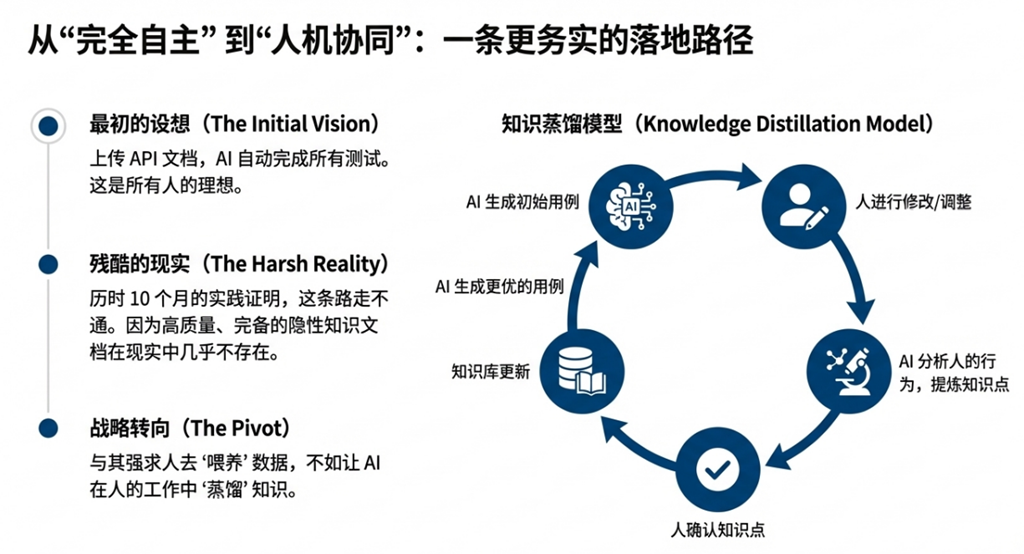 AI原生测试的落地之路并非一帆风顺。行业先驱者们在探索过程中,逐渐从追求“完全自主测试”的理想化目标,回归到更为务实和可持续的“人机协同”路线上来。这一转变,是基于深刻的实践教训和对现实世界复杂性的妥协,同时也催生了新的测试范式。