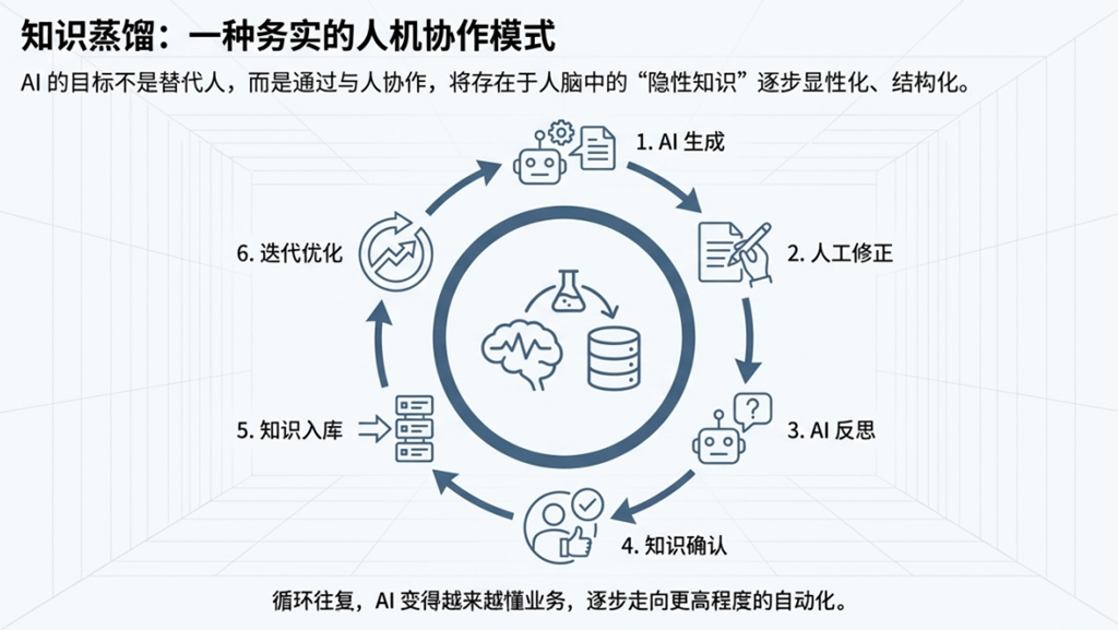 面对“完全自主”的困境,一种新的、更现实的解决路径应运而生:AI不再试图完全取代人,而是通过伴随人进行工作,逐步将人的隐性知识“蒸馏”出来。