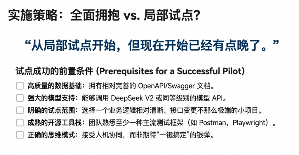 综合专家的观点,当前阶段,“局部试点”是所有企业启动AI原生测试的最佳选择。“如果今天才开始试点,其实都有点晚了”,凸显了启动的紧迫性。全面拥抱的时机尚未成熟,而从小项目开始的局部试点,能够以较低的成本和风险,帮助企业积累宝贵的数据、经验和人才。