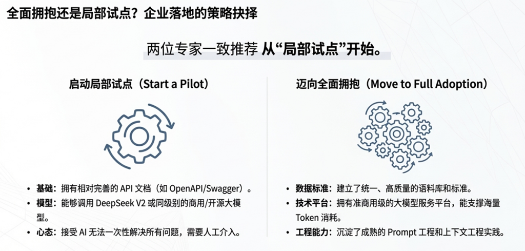 • 数据基础: 试点项目必须具备相对完善的数据基础,特别是如Swagger/OpenAPI等标准化的API文档,这是AI发挥作用的起点。