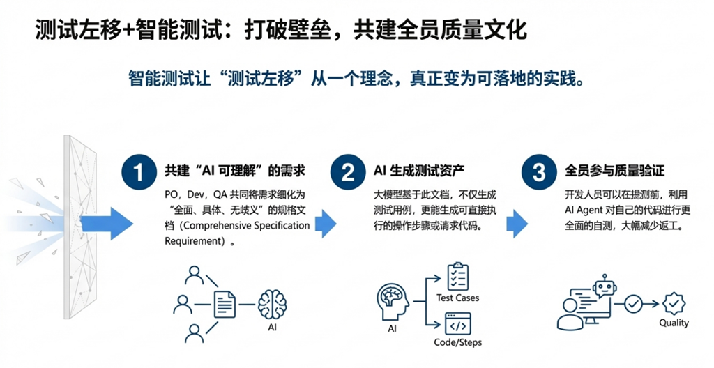 AI技术的深度融入,正在打破传统的组织边界和角色分工,推动着一场深刻的人员与组织变革。“测试左移”的理念被赋予了新的内涵,测试人员的核心竞争力正在发生迁移,而企业的考核指标也随之演变。