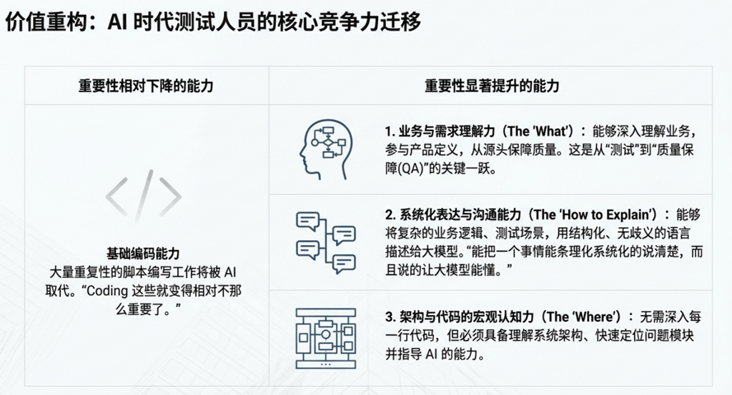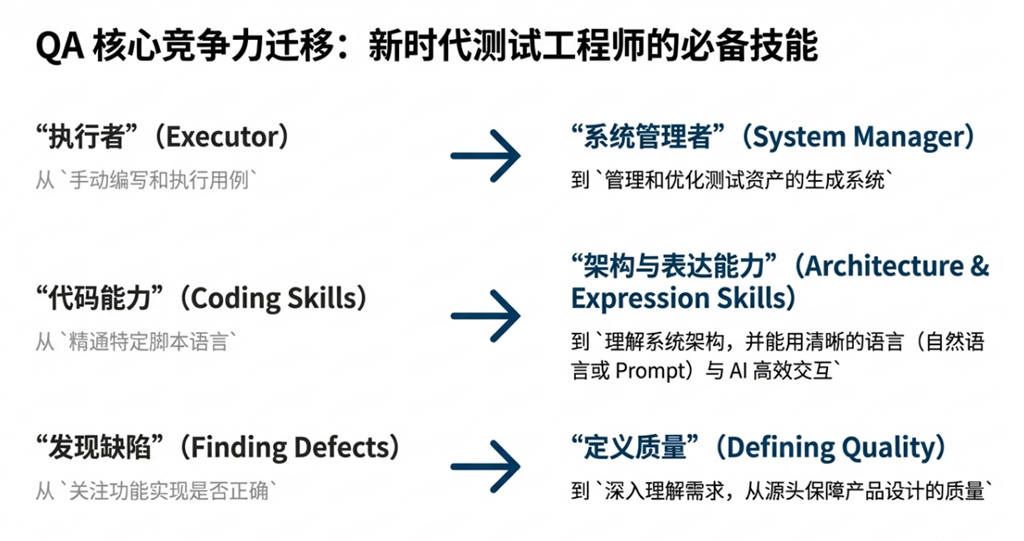 在AI时代,QA的核心竞争力正在发生根本性的迁移。繁重的编码和执行工作被AI大量替代,对人的要求则转向了更高阶的能力。