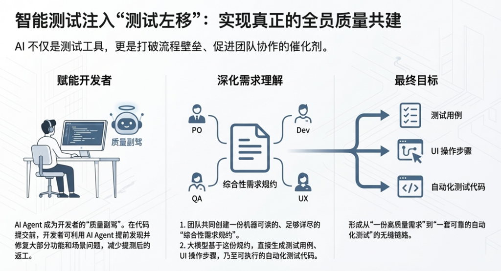更深层次的“测试左移”,体现在需求阶段的变革上。正如所倡导的,通过产品、QA、开发等多方协作,共同产出一份大模型可以深度理解的、详尽的Comprehensive Specification Requirement (全面规格需求) 文档。这份文档不仅描述业务流程,更细化到UI操作、边界条件和异常处理。它将成为统一的“知识源”,直接驱动后续的自动化测试用例生成与代码生成,真正实现从源头保障质量。这两个趋势是共生的:AI工具为开发者自测降低了门槛,而机器可读的需求规格则为AI提供了高效运作所需的高质量输入,从而形成了一个将质量内建于源头的良性循环。