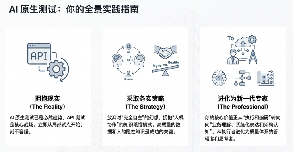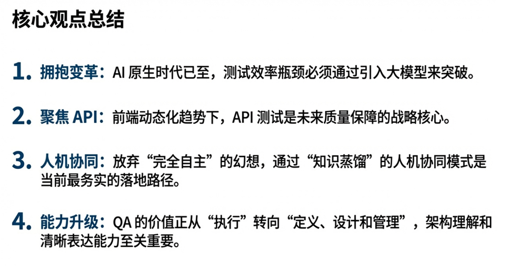 • 投资于人: 技术变革的最终落点是人。企业应积极引导并投资于QA团队的能力转型,大力培养其业务理解、架构思维和与AI高效协作的能力。对于个人而言,主动拥抱变化,从执行者向“AI训练师”和“质量体系构建者”的角色转变,将是未来职业发展的关键。