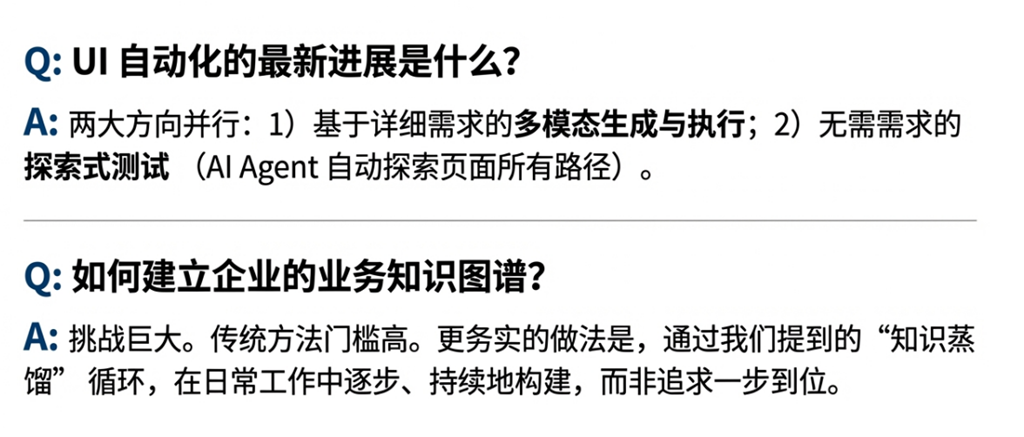 4. 人类确认与沉淀: AI将提炼出的知识点呈现给人类专家进行确认。一旦确认,这些知识便被结构化地存入知识库,用于指导AI未来更精准地生成测试。
