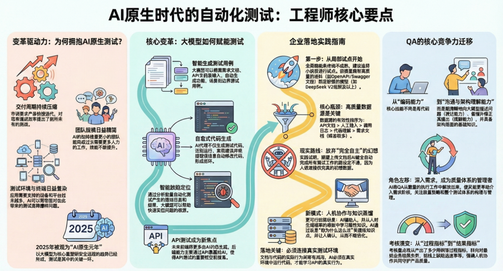 • 聚焦API与数据治理: 将有限的资源优先投入到API测试的AI赋能上,因为这是当前技术趋势下ROI最高的领域。同时,必须着手进行数据治理,建立高质量、标准化的数据源,尤其是完善的API文档体系,这是AI发挥作用的根本前提。