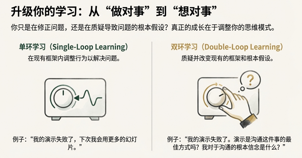 单环学习让你成为现有游戏中的高效玩家,而双环学习则赋予你重新设计游戏规则的能力。对于领导者而言,后者才是实现非线性成长的关键。它能让你从根本上解决问题,而不仅仅是处理问题的症状。