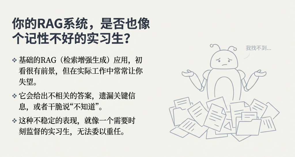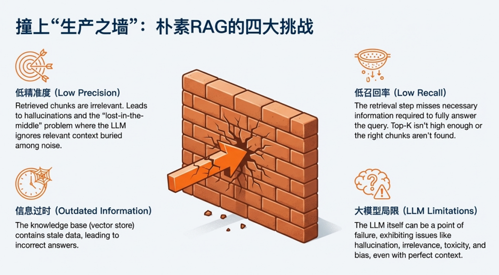 然而,许多开发者很快发现,一个基础的“朴素RAG”(Naive RAG)系统往往不够好。在实际应用中,它面临着诸多挑战,导致性能不尽如人意: