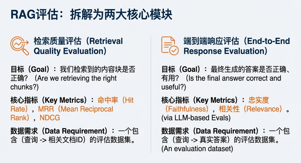 没有衡量标准,任何优化都如同在黑暗中摸索。评估RAG系统通常需要从以下两个关键维度进行,这使你能够使用成熟的信息检索指标(如命中率 Hit Rate 或归一化折损累计增益 NDCG)来客观地衡量检索器的性能。