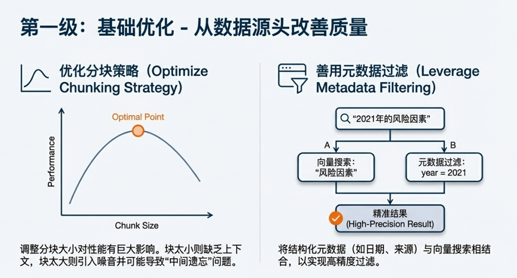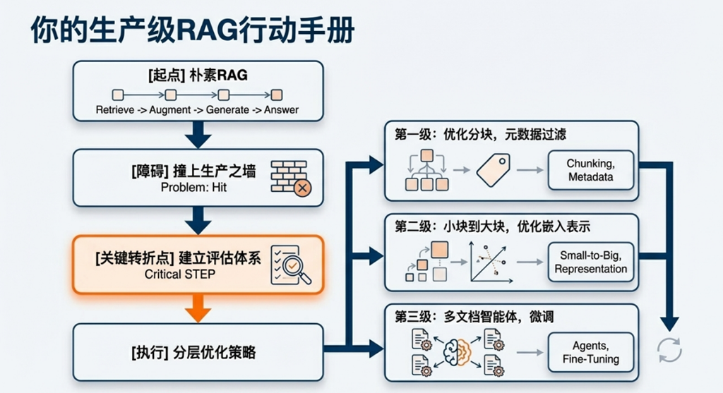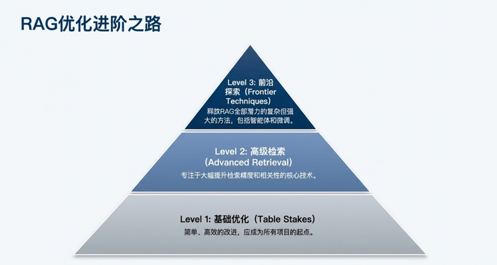 本文的目标就是为你提供一个清晰的、分层级的优化路线图。我们将从建立评估体系这一关键起点出发,逐步探索基础技巧、进阶策略,直至前沿的智能体与模型微调技术,帮助你系统性地将RAG应用从“能用”提升到“好用”。