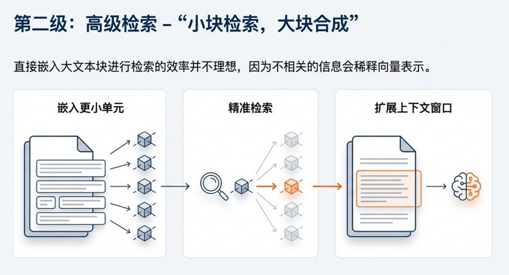 进阶检索 | 平衡检索精度与生成所需的上下文。 | 当相关信息存在但被周围文本“淹没”,或需要精确控制上下文时。 |