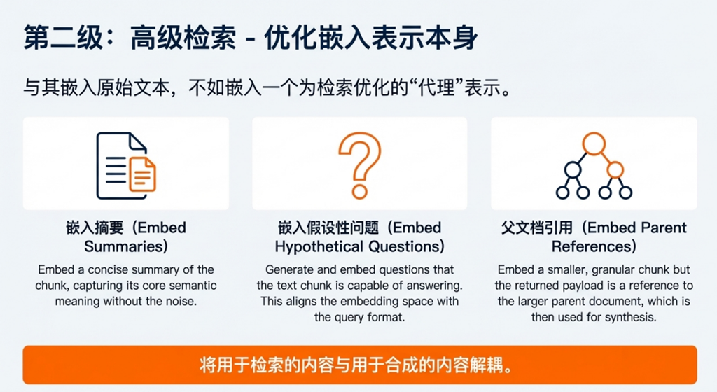 这种方法的根本逻辑在于解耦(decoupling)了检索内容与合成内容。我们为检索嵌入的是高度优化的信息(如摘要或问题),但在合成阶段,我们依然向LLM提供完整的原始文本块,从而同时实现检索的精准性和生成的完整性。