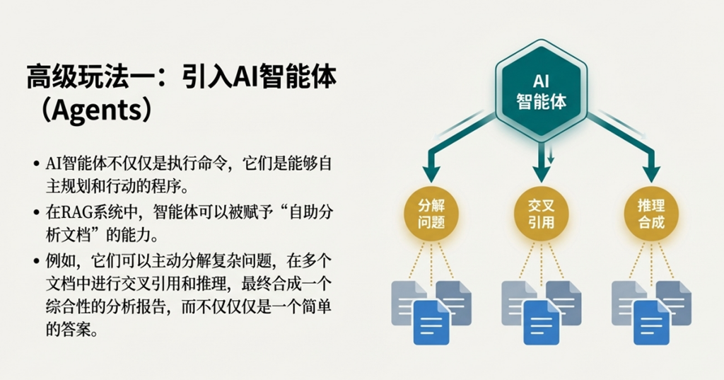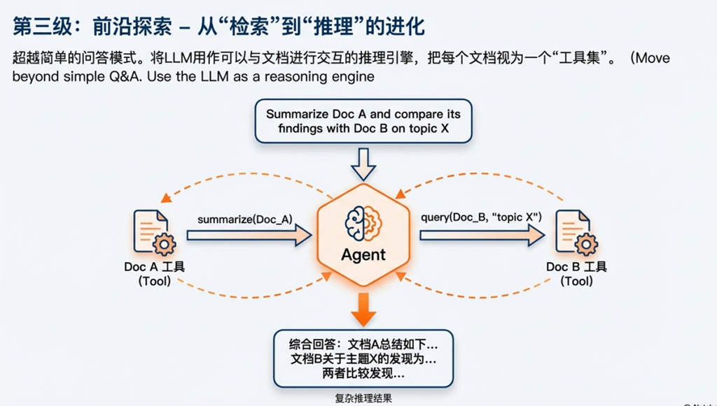 智能体的巨大优势在于它能执行一系列推理步骤。面对一个复杂问题(例如,“对比A、B两份文档的观点差异”),智能体可以自主规划,调用不同文档的工具获取信息,最后综合结果进行回答。这是简单的Top-K检索无法完成的。