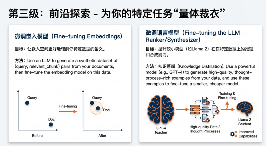 • 方法:一种常见的做法是,使用LLM从你的原始文本块中合成生成大量的**“问题-文本块”对**(即,针对一个给定的文本块,生成一个该文本块能完美回答的问题)。然后,用这些高质量的数据来对嵌入模型进行微调。