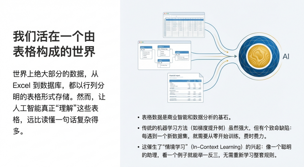 表格,作为一种由行列构成的结构化数据格式,是现实世界应用中最主要的数据组织形式之一,其在机器学习领域的重要性不言而喻。然而,长期以来,表格数据的预测任务一直由梯度提升树等传统机器学习方法主导。近年来,情境学习(In-Context Learning, ICL)范式被成功应用于表格数据,催生了新一代的表格基础模型,并在中小型数据集上展现出卓越性能。