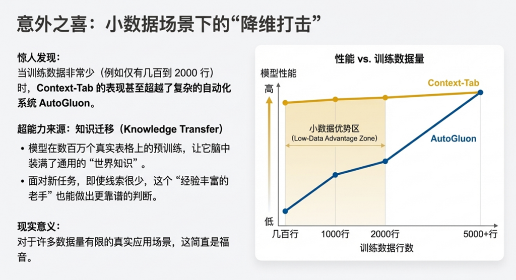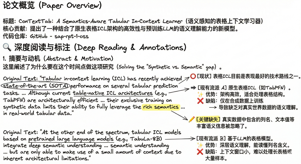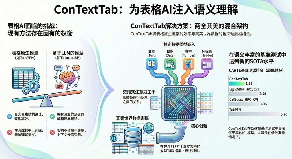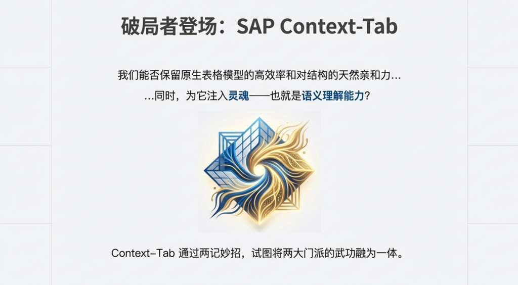 ConTextTab的核心设计哲学在于“两全其美”——它旨在将大语言模型级别的深度语义理解和世界知识,无缝注入到一个高效、为表格数据原生设计的ICL框架中。其目标是创造一个既能理解数据“说什么”(语义),又能高效处理数据“长什么样”(结构)的模型。另一个名字是SAP-RPT1-OSS