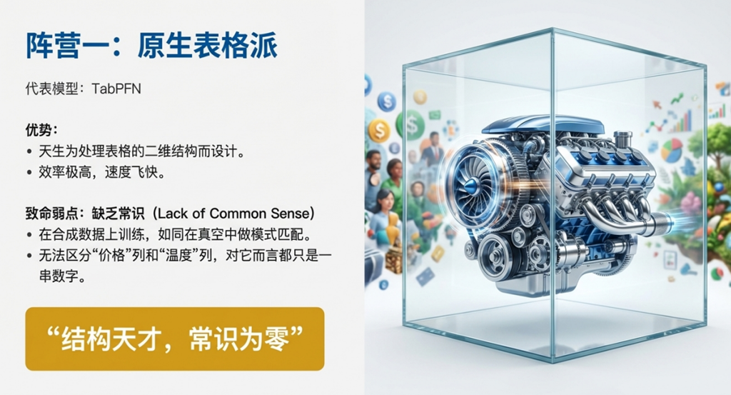 当前,表格情境学习领域主要存在两种技术路线。第一类是以TabPFN和TabICL为代表的“原生表格模型”,它们采用为表格结构量身定制的高效架构,并通过在海量合成数据上预训练来获得泛化能力。这类模型的架构效率极高,但其致命弱点在于缺乏对真实世界数据中丰富语义和世界知识的理解能力。例如,它们无法以有意义的方式利用列名或文本类别标签中蕴含的深层信息。