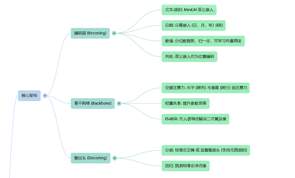 文本 (含分类特征) | 使用预训练的all-MiniLM-L6-v2文本嵌入模型将每个单元格的文本(无论是自由文本还是类别标签)转换为向量,再通过一个可学习的线性层调整维度。 | 保留深层语义:与传统的独热编码或序数编码不同,该方法能捕捉到类别标签(如“笔记本电脑”和“台式机”)之间的内在含义和关联,极大地丰富了模型的输入信息。 |