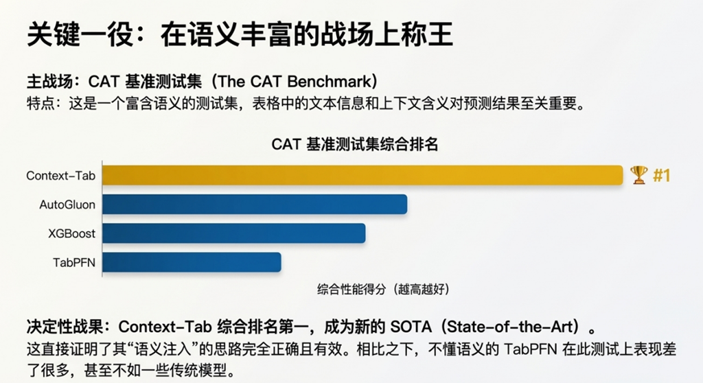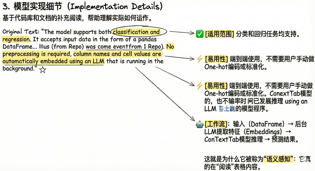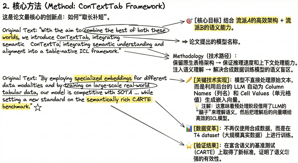 ◦ 主要优势 (So What?): 这种方法能保留其“语义含义”。这种理解语义的能力之所以成为可能,是因为ConTextTab在数百万个真实世界的表格上进行了预训练,从而学会了“Laptop”这类词语和“电子产品”这类概念之间的关系。