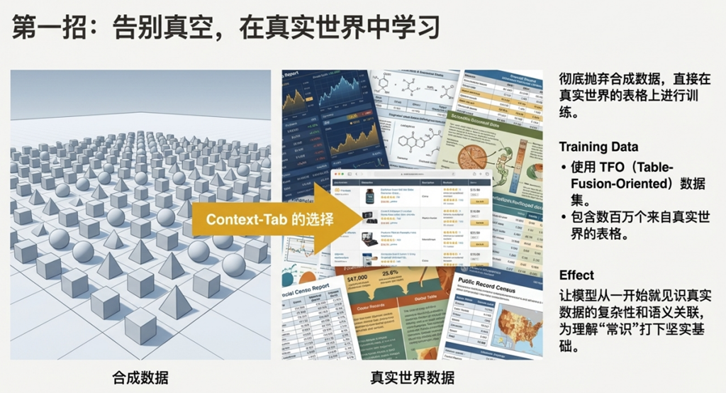 ConTextTab(2506.10707)的核心目标,是将表格原生模型的高效性与大型语言模型(LLM)的深度语义理解能力相结合。为了实现这一目标,ConTextTab的底层设计理念是:模型的强大能力源于在大规模的真实世界表格数据上进行训练。这与过往的方法形成了鲜明对比: