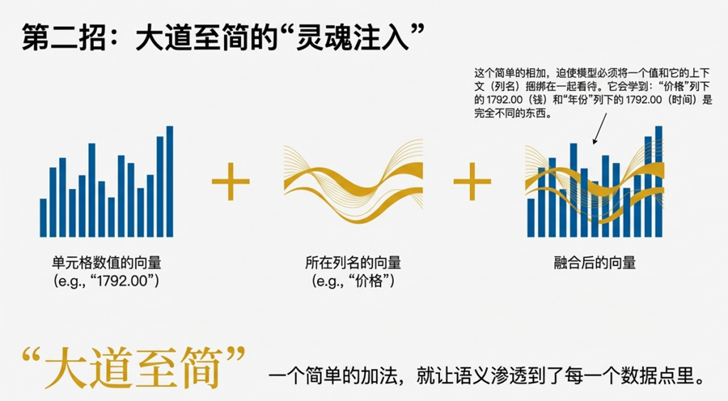 列标题 | 使用与文本单元格相同的嵌入模型对列标题进行编码,通过一个独立的线性层映射维度后,与该列下所有单元格的嵌入向量相加。 | 提供语义化位置信息:列标题的语义嵌入取代了传统的位置编码,为模型提供了关于每一列具体含义的上下文信息,使得模型能够理解特征的本质。 |