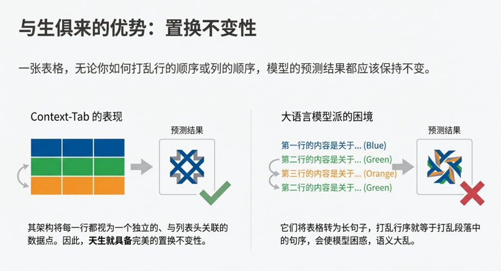 这些编码策略共同作用,最终实现了一个至关重要的特性——行列排列不变性(equivariance)。这意味着无论表格的行或列如何重新排序,模型的预测结果都保持一致。这一特性不仅使模型的预测更加鲁棒和可复现,还减少了对数据预处理顺序的依赖,是衡量一个优秀的表格模型设计的重要标准。