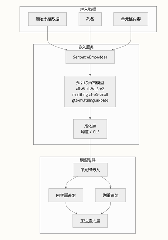 该架构将预处理分离为处理语义理解的后台嵌入服务,而核心模型专注于表格模式识别。这种设计使模型能够利用世界知识,同时保持表格结构的高效性。