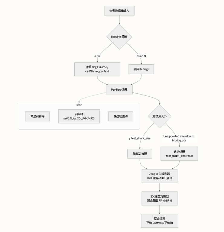 系统采用分层可扩展框架,在多个维度上运行:数据采样、批处理、分布式嵌入生成和内存优化。这种设计使模型能够处理超出即时上下文窗口的数据集,同时保持预测质量和资源效率。这种架构实现了推理时间与数据集大小的线性扩展,同时保持每批次的恒定内存占用,使得在有限的 GPU 资源上处理数百万行数据成为可能。