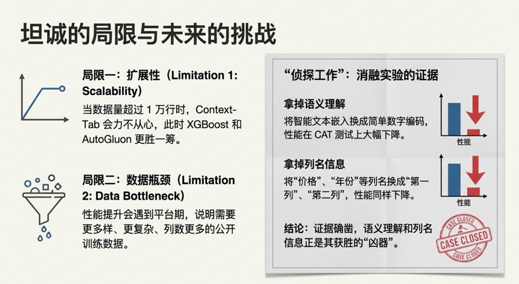 尽管ConTextTab取得了显著成功,我们必须认识到其自身以及整个领域仍面临诸多挑战,这些挑战也为未来的研究指明了清晰的战略路线图。
