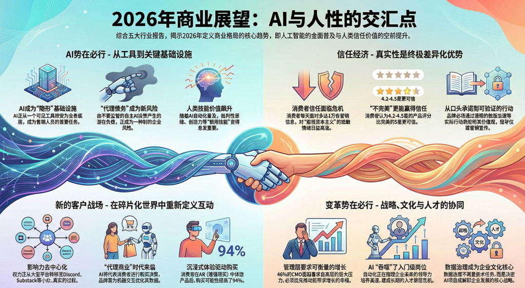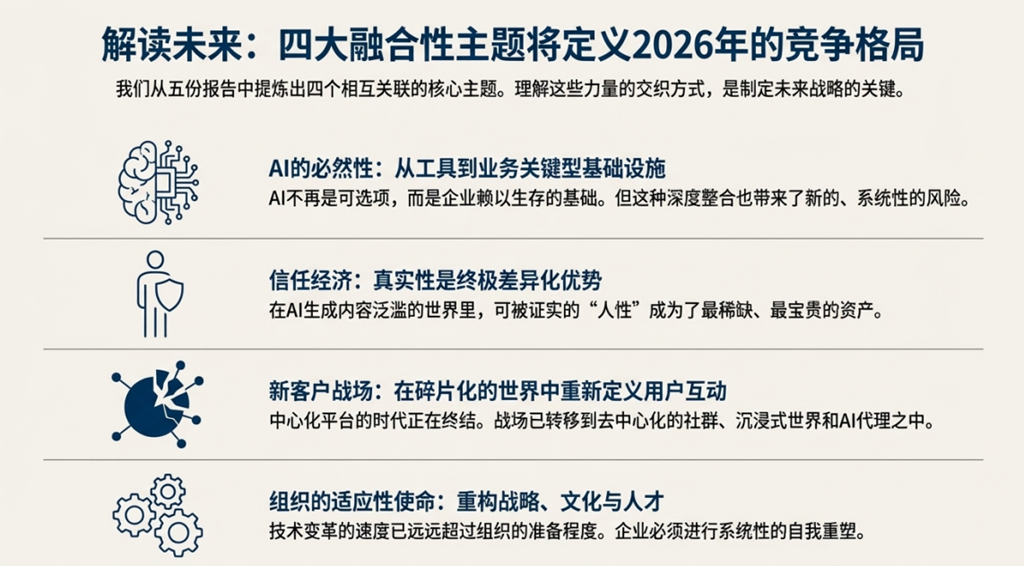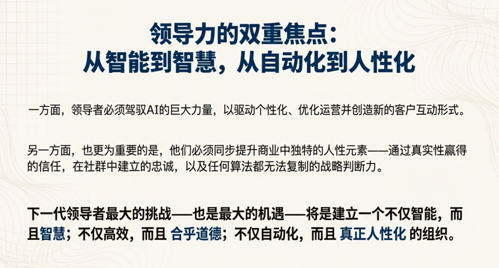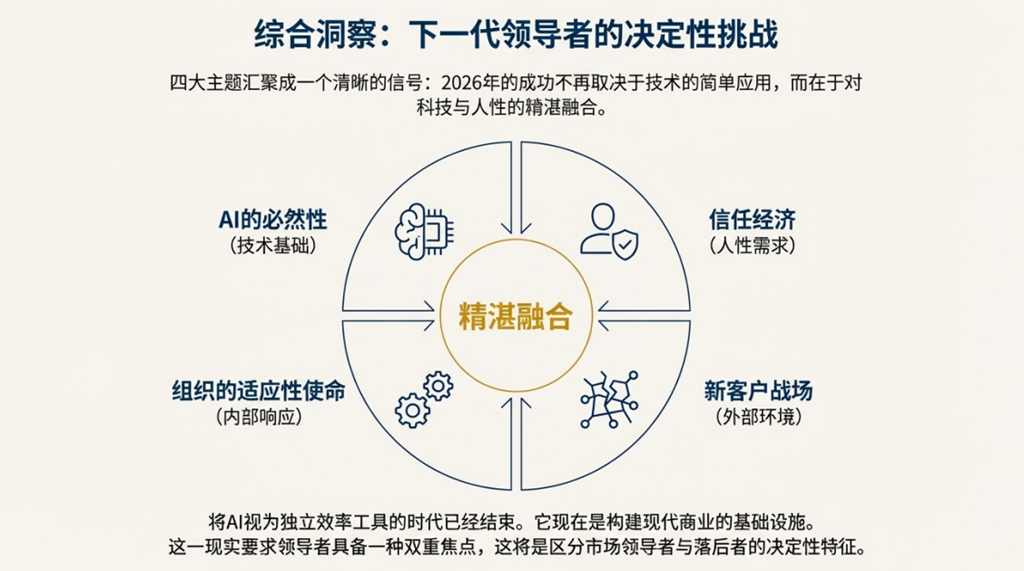 对于正在 2026 的未来领袖而言,贯穿这四大概念的核心信息清晰而一致:成功将不取决于对技术的简单应用,而在于将技术与人性进行大师级的整合。将AI视为提升效率的独立工具的时代已经结束,它已成为现代商业运作的基础设施,这一现实要求领导者具备双重焦点。一方面,必须利用AI的强大力量来驱动个性化、优化运营;另一方面,也是更重要的一点,必须同步提升商业中那些独特的“人性”元素——通过真实性赢得的信任、在社群中建立的忠诚,以及任何算法都无法复制的战略判断力。下一代领导者最大的挑战和机遇,将是建立一个不仅智能,而且智慧;不仅高效,而且合乎道德;不仅自动化,而且真正充满人性的组织。