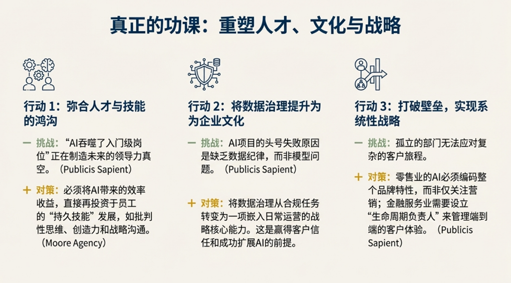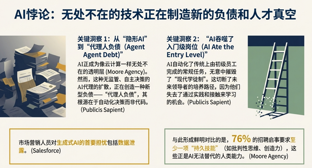这可能是最关键的长期风险。一方面,The Moore Agency 指出“持久技能”(如创造力和批判性思维)的价值正在迅速提升。另一方面,Publicis Sapient 发出严厉警告:“AI正在吞噬入门级岗位”。这两者结合揭示了一个迫在眉睫的危机:公司在自动化初级岗位的同时,也在无意中摧毁了自己未来的领导力管道。