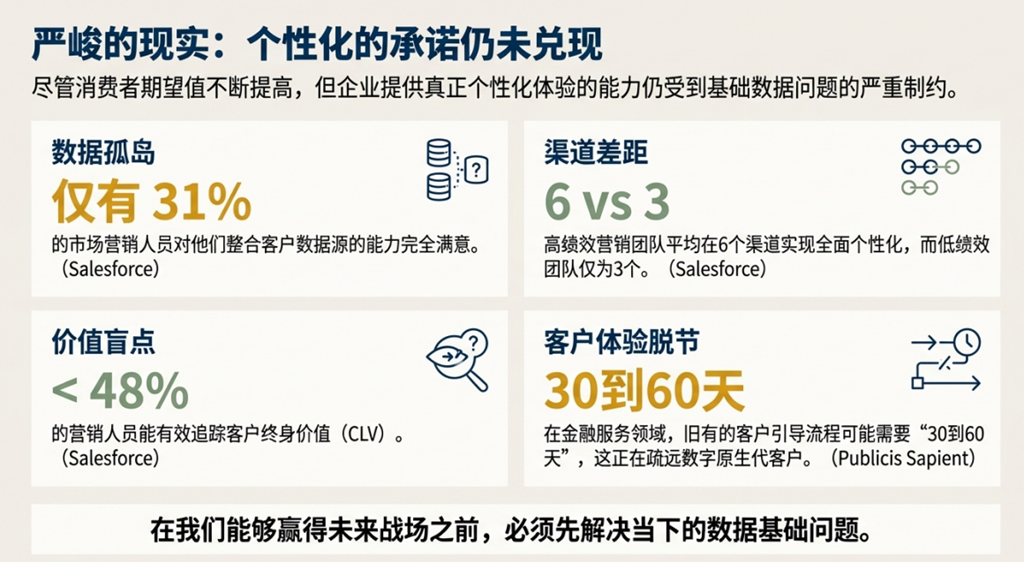 数据不再仅仅是 IT 部门的技术问题,而是关乎企业生死的核心战略议题。Publicis Sapient 明确指出,人工智能项目“很少因为模型有缺陷而失败;它们失败是因为缺乏数据纪律。”这一观点与 Salesforce 报告中揭示的营销人员在统一数据源方面的普遍困境相互印证,强调了将数据治理融入企业文化的重要性。