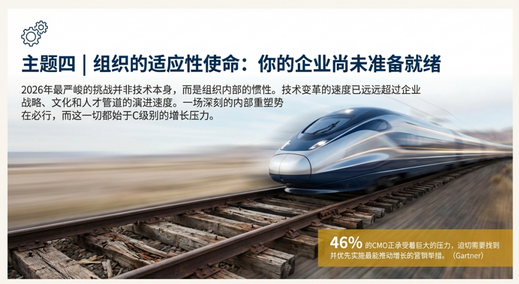 所有变革都发生在一个高压的背景下。根据咨询公司 Gartner 的研究,46% 的首席营销官(CMO)正面临来自高层管理的巨大压力,要求他们必须实现可衡量的业务增长。这种对增长的迫切需求,为推动组织内部的战略和文化转型提供了最直接的商业理由。