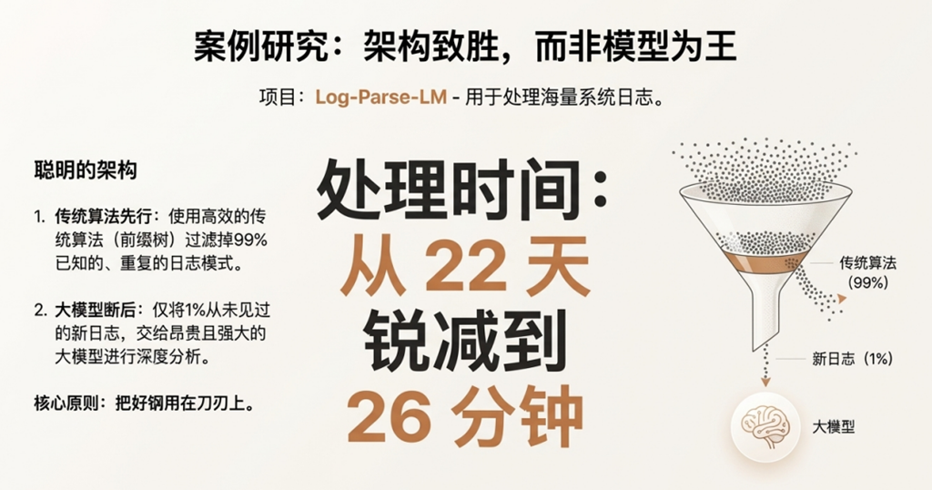 - LogParser-LLM:面对海量日志,单纯用LLM处理成本过高。该方案采用“99%常规处理 + 1%关键智能”的策略。利用高效的前缀树(Prefix Tree)算法缓存已知日志模板,仅当遇到未知(Unknown)日志时才调用LLM进行解析。这种设计将处理360万条日志的时间从22天(GPT-3.5)压缩到了26分钟。