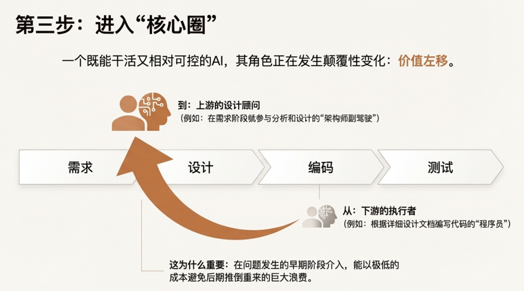 AI在软件工程中的应用正在从下游的代码编写向游的需求分析推进,这一过程被称为“研发左移”。