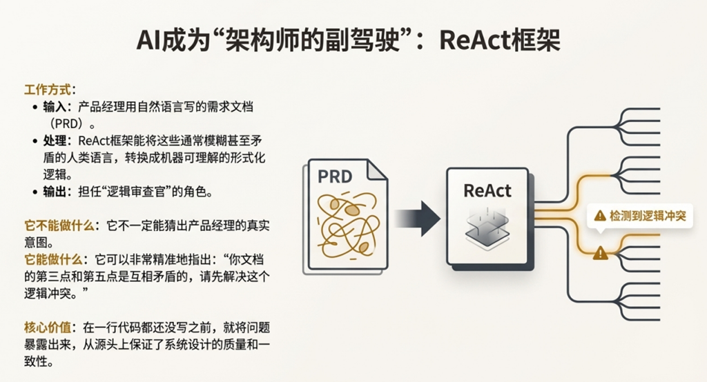 - REACT框架:利用LLM将模糊的自然语言需求转化为结构化的受限英语(Restricted English),并进一步转化为形式化逻辑(如LTLf)。这使得在代码编写之前,就能通过逻辑验证发现需求中的冲突与漏洞。