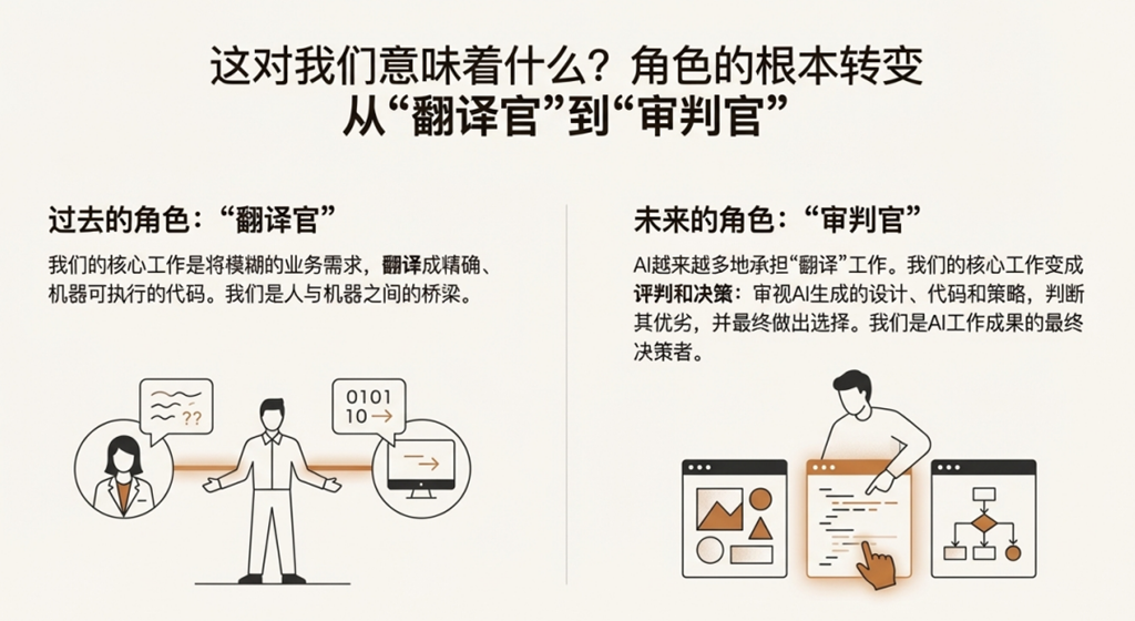 - 人的价值回归:随着AI接管了代码编写与基础分析,人类工程师的价值将从“翻译官”(将需求翻译为代码)升维为“决策者”与“审判官”。培养具备批判性思维、能够运用“第一性原理”与“苏格拉底法”的高阶人才,将是组织穿越周期的唯一方舟。