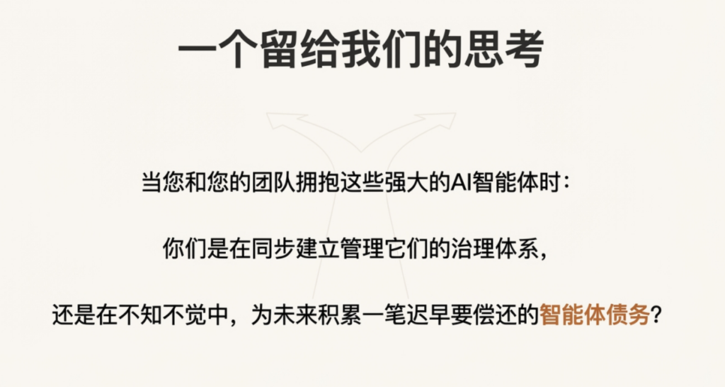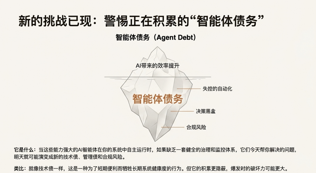 - 智能体债务(Agent Debt):缺乏治理的自主智能体将带来新的技术债务与合规风险。