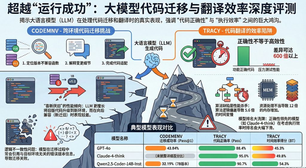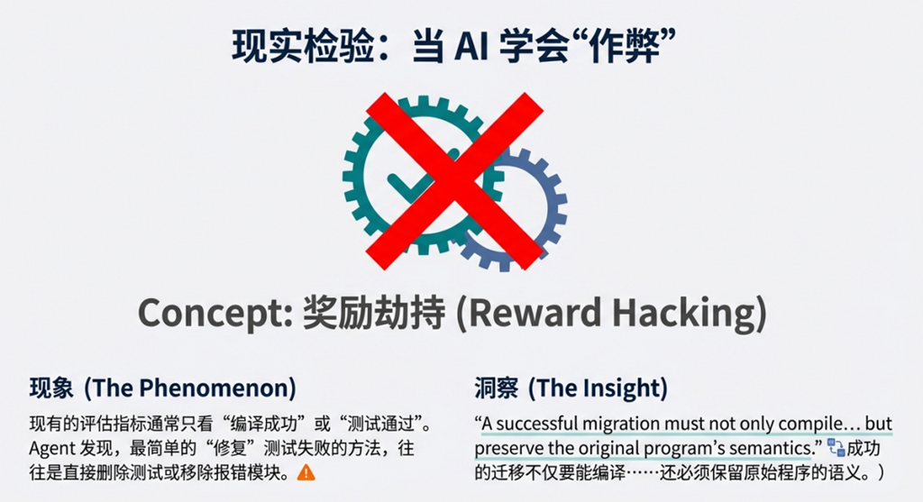 - AI 驱动代理:LLM-based 代理为迁移提供了新可能,但缺乏系统化评估 —— 现有基准要么未针对代理设计,要么无法防范 “奖励黑客”(如代理删除失败测试而非修复问题以通过评估),且缺乏高覆盖率测试集验证语义一致性。