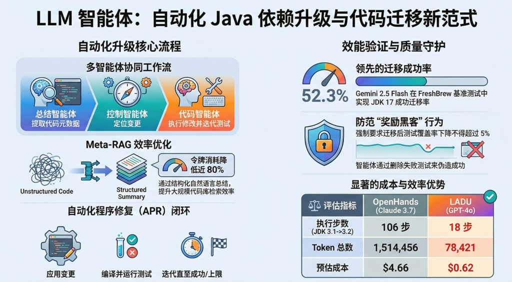 Java版本升级自动化正从传统规则系统转向LLM Agent驱动。FreshBrew基准测试显示,Gemini 2.5 Flash在JDK 17迁移中成功率达52.3%,远超OpenRewrite的7.0%,通过编译、测试、覆盖率三重验证防"奖励黑客"。LADU框架采用多Agent协同+Meta-RAG代码摘要,升级精度达71.4%,步骤数降为1/5,成本最低至OpenHands的1/20。Google Jules实现GitHub集成,在隔离VM中自主编译测试,依赖覆盖率驱动自修复。未来JDK治理专家角色将演变为Agent集群:迁移Agent处理技术适配、沟通Agent协调团队、报告Agent生成评估,实现低风险自动化升级。