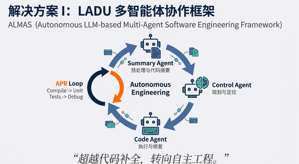 - 验证与迭代:编译项目并运行单元测试,若出现错误,Control Agent接收日志并启动自动化程序修复(APR)循环,重复修改-验证流程;