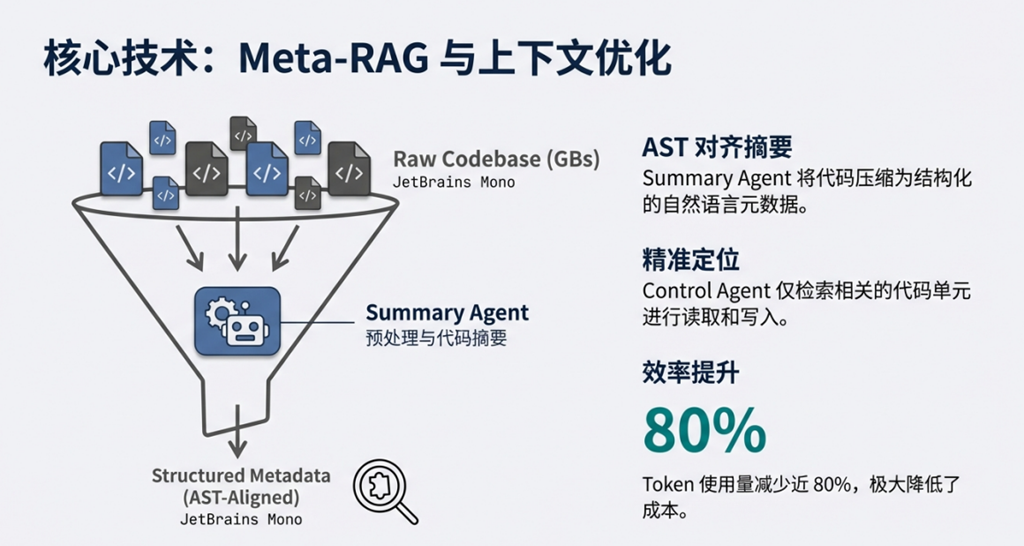 - 引入Meta-RAG机制:通过代码摘要压缩(Token量减少近80%),实现大规模代码库的高效变更定位与信息检索;