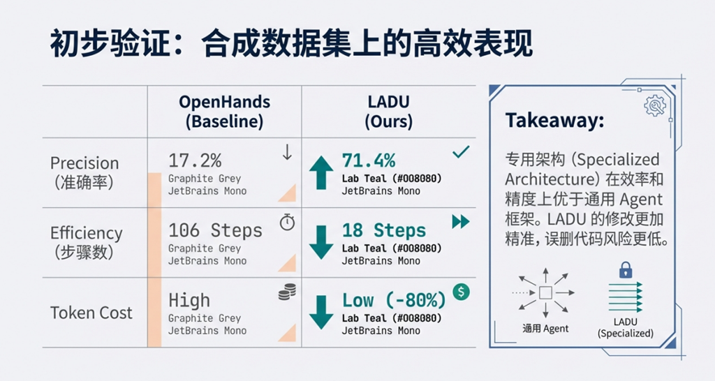 - 实证验证:在工业级合成代码库中,相比现有方案(如OpenHands),该框架在精度、效率(步骤、耗时、Token消耗)上均有显著优势。